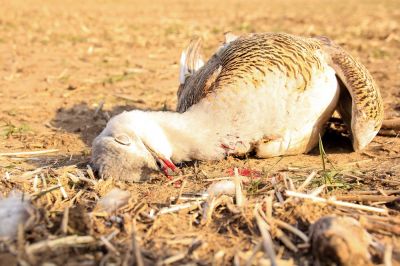 Екипът за полево проучване на дивите гъски и контрол по лова към проекта на БДЗП „Сигурни зимовища за червеногушата гъска” откри тази сутрин отсреляна птица от вида голяма дропла (Otis tarda). Птицата се беше установила за зимуване в района на крайбрежните езера Шабленско и Дуранкулашко, където бе наблюдавана неколкократно в продължение на един месец - от 23.12.2011 г. до днес.