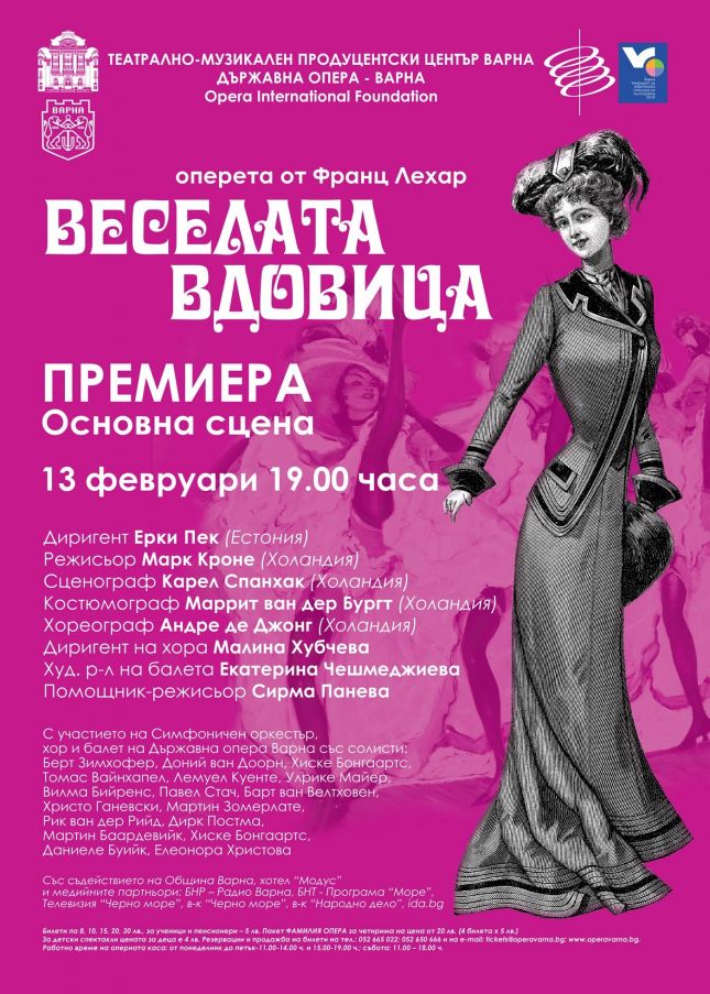 На 13 февруари от 19 часа във Варненската опера ще бъде премиерата на оперетата „Веселата вдовица” на Лехар – копродукция с Opera International Foundation. Постановъчният екип е почти изцяло холандски: режисьор е Марк Кроне, сценограф - Карел Спанхак, художник на костюмите - Маррит ван дер Бургт, хореограф - Андре де Джонг. Диригент-постановчик е Ерки Пек от Естония.