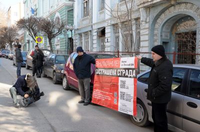 Акцията им започва от най-знаковата рушаща се сграда – разположената на ул. Преслав 24 сграда на Софийската банка, проектирана през 1922 г. от арх. Дабко Дабков.