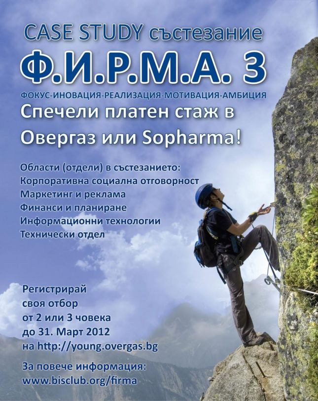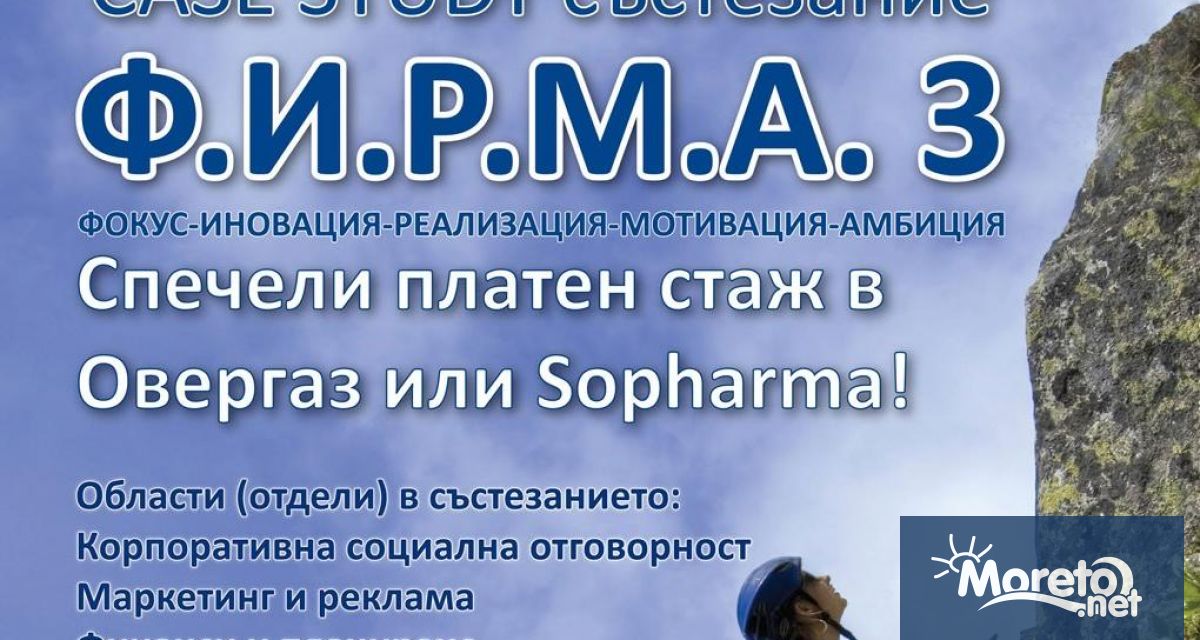 За трета поредна година “Овергаз” ще е партньор на „Research Center“ към Бизнесклуба на Софийския университет „Св. Климент Охридски“ в организацията на състезанието за студенти Ф.И.Р.М.А*. Надпреварата дава възможност на бъдещите висшисти да търсят решение на казуси, с които големите компании се сблъскват всеки ден. За първи път тази година като партньори ще се включат и Българската мрежа на Глобалния договор, Софарма, както и Висшето училище по застраховане и финанси.