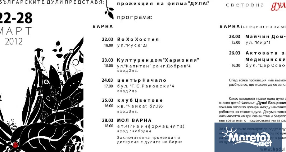 В рамките и духа на СВЕТОВНА СЕДМИЦА НА ДУЛАТА 2012, в София, Варна и Велико Търново, Асоциация на българските дули ще предложи редица безплатни прожекции на документалния филм "ДУЛА!", както и възможност за отворени дискусии, запознаване с местните дули и лично споделени истории на семейства и жени ползвали безценната помощ на дулата по време на раждане (в България), както за бъдещи родители, така и ориентирани специално към медицинския персонал на родилните отделения и обучаващите се медици.