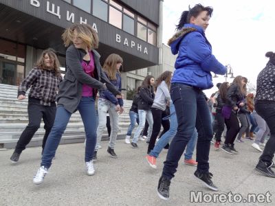 Петдесетина ученици потанцуваха пред общината във флашмоб, посветен на кандидатурата на Варна за Европейска младежка столица през 2015 г. На стълбите под...