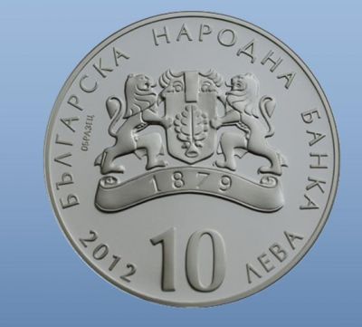 На лицевата страна на монетата е изобразена емблемата на Българската народна банка с годината „1879”, изписана върху лентата. Околовръст са изписани „БЪЛГАРСКА НАРОДНА БАНКА”, номиналната стойност „10 ЛЕВА” и годината на емисия „2012”.