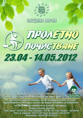 Кулминацията на пролетното почистване във Варна ще бъде на 12 май, съобщиха от община Варна. Купени са 10 хиляди броя торби, част от които са разпределени по райони. Гражданите могат да ги получат и от община Варна. Торби, ръкавици и рекламни материали ще се раздават и на 12 май. В община Варна, както и в районните администрации ще има дежурни служители. На сайта на общината са обявени телефоните за връзка с еколозите. Осигурени са 1 500 жълти торби за разделно събиране на сметта. Извозването им ще става от района пред бл.42 в кв.Чайка, както и пред МОЛ-Варна.