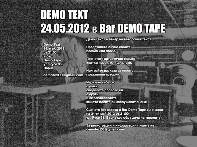 Първата вечер на авторския текст “Демо Текст” ще се проведе на 24-ти май 2012 от 21:00 във варненския бар Демо Тейп (Demo Tape), ул. Русе 33.