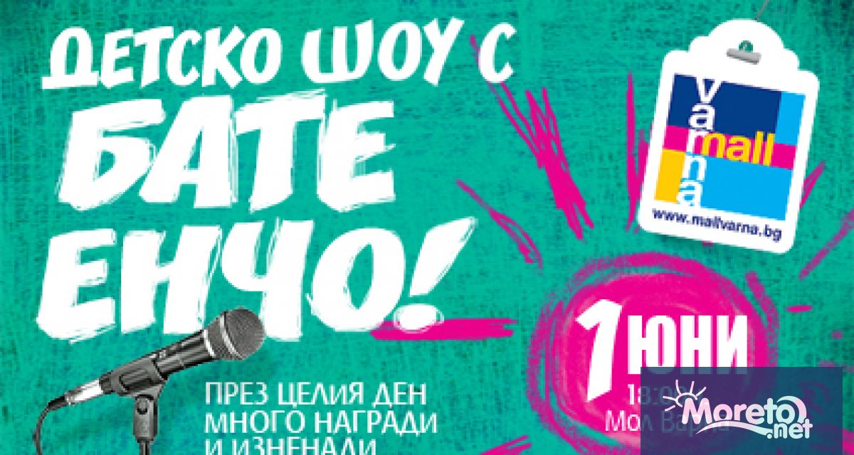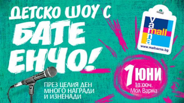 Популярният от телевизионния екран Бате Енчо, познат от най-успешното детско шоу „Кой е по-по-най?”, ще бъде водещ и главен изпълнител на първоюнското тържество в търговско-развлекателен център Мол Варна. Събитието ще се проведе в централното фоайе на Мол Варна от 18 часа на 1 юни. Всички желаещи деца да участват в програмата ще имат възможност да се изявят, като не е необходимо предварително записване. Всяко дете ще може да се представи по избор с песен, стихотворение или танц, като за разлика от телевизионното шоу, възрастово ограничение за малките участници няма. Малчуганите, които се справят най-артистично ще бъдат отличени със специални награди, осигурени от магазините в Мол Варна. Освен това всички участници и гости на първоюнското шоу ще мерят знания в разнообразни игри със забавни викторини, танци и други специално подготвени от Бате Енчо за празника предизвикателства. За децата са предвидени многобройни подаръци, играчки и изненади от търговския център. Вход – свободен!