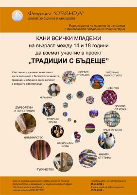 Това лято във Варна ще се проведе младежки проект „Традиции с бъдеще” на Фондация „ Оренда”, финансиран от Община Варна. По време на проекта младежите ще имат възможността да се запознаят с традиционни български занаяти и обичаи и да ги изпитат „от първа ръка”. Проектът ще включва работилници с различни майстори- занаятчии и срещи, на които младежите ще имат възможността да почувстват и пресъздадат изконни български традиции и обичаи. Някои от работилниците, които ще бъдат организирани по време на проекта са: дърворезба и пирография, рисуване върху стъкло, изработка на накити от кожа, грънчарство, художествена керамика и др. Участниците ще могат да съчетаят полезното с приятното, учейки нови неща, придобивайки нови умения, създавайки нови приятели. След края на проекта всеки участник ще получи сертификат за участие.