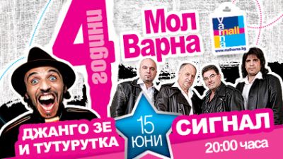 Една от най-обичаните български рок групи Сигнал пристига в морския град за грандиозен концерт, който ще се проведе в търговско-развлекателен център Мол Варна на 15 юни. Музикантите от легендарната формация ще представят на живо пред варненската публика селекция от златната колекция на най-успешните си песни. Събитието, с което Мол Варна ще отпразнува 4 години от откриването си, започва в 20 часа на външния паркинг в търговския център. Програмата включва и участие на една от най-популярните варненски банди Джанго Зе, както и специална изненада от екипа на забавното варненско шоу Тутурутка.
