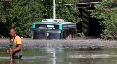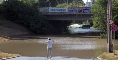 Водата е блокирала в подлеза автобус с 18 души. Изпратени са три екипа пожарникари и спасители, които са изнесли на ръце хората от автобуса през водата. Няма пострадали.