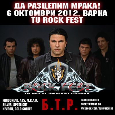 „ТУ рок фест“ е името на музикалнит празник, който ще започне в 17 часа на 6 октомври 2012 г. Във втората част не сцената излизат „ветераните“ от “Minddread” и проектът на домакините “Студена спойка” (Cold Solder Project). Финалният един час е за специалните гости от Б.Т.Р. Модератор на кастинга и водещ на фестивала ще е самият Данчо Караджов от група "Сигнал". Светлинно шоу, фойерверки и още куп изненади ще има в нощта на рока в ТУ Варна.