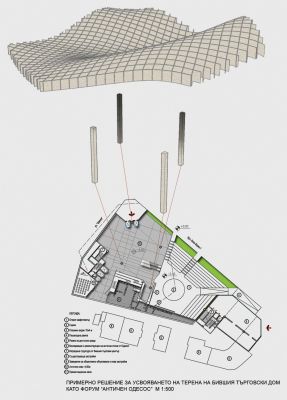 Идеята е този очевиден дефект да се превърне в ефект. От една страна се подхожда рационално, като се използват изградените основи по предишния проект за търговска сграда, от друга страна се обособява една съвсем нова, привлекателна, отразяващa спецификата на Варна територия за социална комуникация и култура. Проектът предвижда създаване на открит обществен форум - многофункционално градско пространство с амфитеатър за различни артистични прояви, шоу спектакли и други културни и публични събития. Възможностите за рекреация и развлечение в един съвременен екстериор с вписани в дизайна на средата археологически артефакти, част от които могат да се възприемат от нивото на булеварда през остъклени люкове, наличието на голям мултимедиен екран, както и на ескалатори и остъклени асансьори между двете нива на форума, със сигурност ще създадат онзи атрактивен притегателен фокус, от който центърът на Варна отдавна се нуждае.