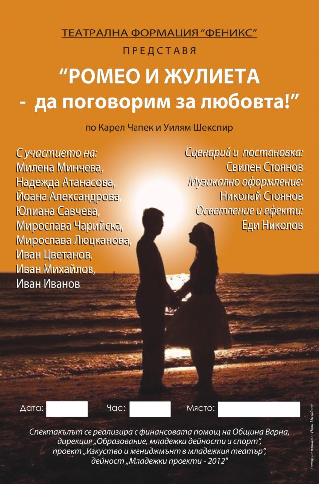 С поредния си четвърти за последните 3 години спектакъл ще зарадва приятелите си театралната формация „Феникс“ към сдружение „Феникс 2009“. Утре от 17 ч в Концертната зала на Младежкия дом младежите и девойките от трупата ще покажат предпремиерно постановката “Ромео и Жулиета - да поговорим за любовта!” по Карел Чапек и Уилям Шекспир. Входът е свободен.