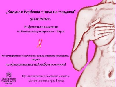 Днес, в предпоследния ден от месец октомври – месеца на борбата срещу рака на гърдата в световен мащаб - студентите от Студентски съвет към Медицински университет – Варна и Асоциацията на студентите по медицина в България ще провеждат информационна кампания сред населението на Варна под мотото: "Не всяко възелче е рак, но профилактиката е най-доброто лечение!".