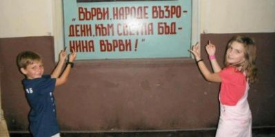 На снимката позират двама ученици – момче и момиче, видимо от малките класове, които без свян правят неприлични жестове към картина от стената. На нея може да се прочете знаменитият рефрен от един от най-светлите химни на българската просвета и култура „Кирил и Методий“ - „Върви, народе, възродени...”.