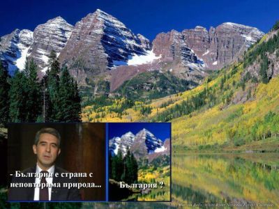 Една от снимките обаче предизвика мигновени реакции. В последните минути на 2012-а президентът описва България с думите, че е от най-старите държави в Европа, с древна култура, богата история и неповторима природа - думи, изречени на фона на Царевец в Търново, а веднага след него идва и красивият пейзаж на заснежени планински склонове. Картина, която мнозина потребители на социалните мрежи веднага разпознаха като пейзаж от известната Rocky Mountain (Скалистите планини) в щата Колорадо, Северна Америка.