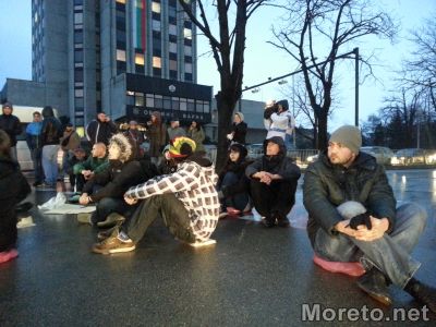 18:06 ч. Около 15 протестиращи седнаха на пешеходната пътека и блокираха движението пред общината