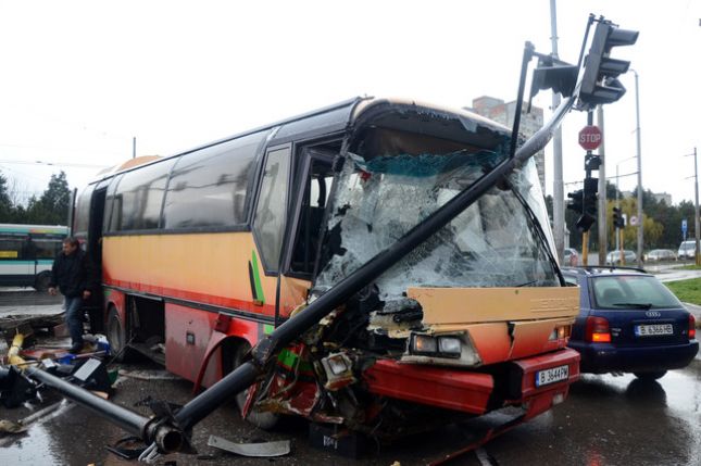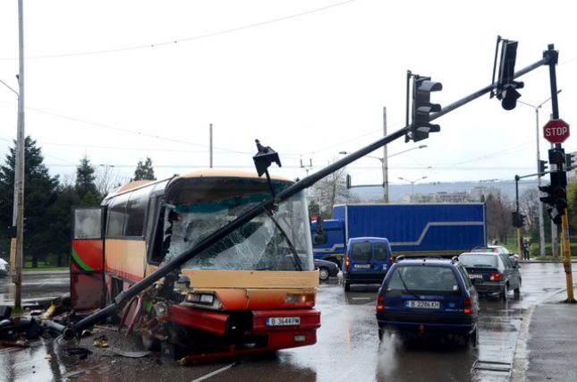 Рейсът е навлязъл в насрещното, ударил се е в светофара, който е паднал върху него. При тежкия инцидент е пострадал и лек автомобил такси.