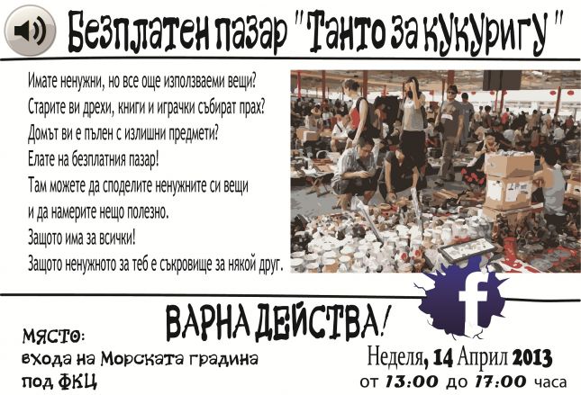 "Неделя - 14.04.2013 от 13:00 часа на входа на Морската градина във Варна - за първи път ще се състои наистина свободен пазар. Идеята е осъществена от гражданското сдружение "Варна Действа" и реализира вижданията ни за пазарни отношения без пари и солидарна размяна, съобщават от гражданското сдружение.