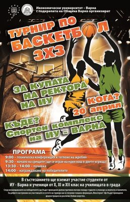 Икономически университет – Варна, за втора поредна година организира турнир по баскетбол 3 х 3 за Купата на Ректора на ИУ, с подкрепата на Община Варна. Състезанията ще се проведат в обновения Спортен комплекс на Университета, като право на участие ще имат студенти от ИУ - Варна и ученици от X, XI и XII клас на училищата в града. Целта на събитието е да се обогати спортния календар на учащите и да се популяризира спорта сред ученици и студенти, както и да се постигне партньорство и диалог в прехода от средното към висшето образование. Учениците - спортисти ще имат възможност да получат информация относно кандидатстудентския прием и възможностите, които открива придобиването на висше образование в нашия Университет. Всеки участник в състезанието ще получи възпоменателна грамота и фланелка, а най - добрите ще бъдат наградени с медали, купи и други награди. Към тях ще бъде отправена покана лично от Ректора на ИУ - Варна за продължаване на образованието им в ИУ – Варна. За доброто настроение на участниците и гостите на турнира ще бъдат проведени демонстрации на различни бойни изкуства. Спортният празник ще завърши с демонстративни мачове между студенти и ученици за момчета и момичета.
