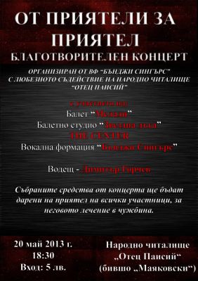 Вокална формация "Бънджи Сингърс" организира благотворителен концерт със заглавие "От приятели за ПРИЯТЕЛ". Събраните средства от концерта ще бъдат дарени на приятел на всички участници, за неговото лечение в чужбина.
