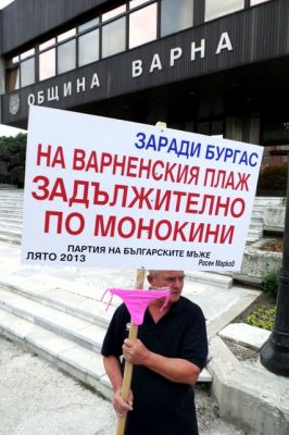 Задължително по монокини на плажа, иска Партията на българските мъже. Нейният председател Росен Марков настоява за това пред сградата на общината. Щом в Бургас тръгнаха пастори, спасители, родители и психолози да искат забраната за монокини местния парламент, ние пък сме за табу на излишните дрехи край морето, каза Марков. Във Варна, където е партийната централа, искаме жените по монокини на плажа, категоричен е местният зевзек. В Бургас ако искат и по шлифери да трупат тен,смята той.