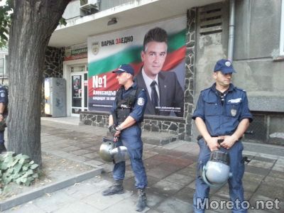 Протестиращи целиха надпписа на ДПС с яйца, но полицията се намеси.