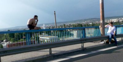 Сигнал на тел.112 подали очевици. На мястото има полицейски екипи, екип на пожарната и на спешна помощ. Мъжът е гол до кръста, с черни шорти. Докато е стоял на парапета на моста е разговарял по телефона си. Видимо е притеснен. В момента психоложка разговаря с него и го разубеждава да не предприеме фаталният скок.