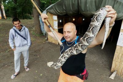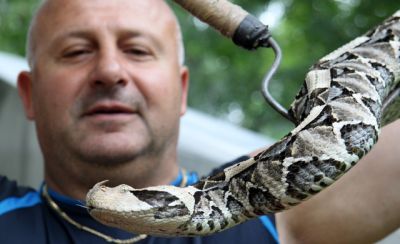 Габонската отровница е един от обитателите на пътуващия терариум, разположен в Морската градина във Варна. Змията беше пусната на "разходка" на открито.