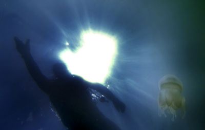 Водолаз да плува в близост до огромна медуза Ризостома (Rhizostoma pulmo) в Черно море далеч вече не е рядкост. Тази снимка е направена в района на местността Фичоза край Варна. Медузите от този вид достигат средно до 60 см в диаметър и е една от атракциите за подводните фотографи заради интересната форма и обем. Плуването около медузи винаги трябва да се извършва особено предпазливо, контактът с тях причинява алергични реакции по кожата, предизвикани от слуз, която се отделя от пипалата им. Те отделят веществото серотомин, а също и таласин.
