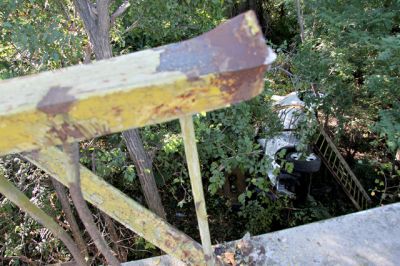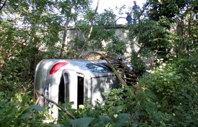 Лек автомобил "Пежо' изхвърча и падна в дере по пътя за Златни пясъци. При инцидента колата е разкъсала предпазния парапет и е паднала на дълбочина 3-4 метра, а няколко железа са паднали върху нея.