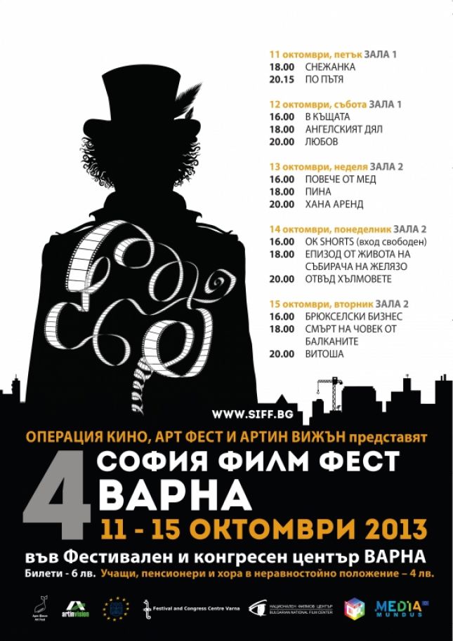 Четвъртото издание на София Филм Фест – Варна ще бъде открито тази вечер от 18.00 часа в Зала 1 на Фестивалния и конгресен център (ФКЦ) от основателя и директор на София Филм Фест – Стефан Китанов. За фестивалната атмосфера ще допринесе и танцов спектакъл на The Center по музика от репертоара на Нанси Синатра. Първата прожекция е на интригуващия черно-бял разказ на Пабло Бергер „Снежанка”. Мрачната приказка на Братя Грим е пренесена в романтиката на 20-те години в Испания. Режисьорът използва изцяло експресивния потенциал на нямото кино, за да опише златната ера на коридата с помощта на кръвожадно, напомнящо за света на Гоя, насилие. Веднага след това, от 20.15 ч, ще се завърти екранизацията на прочутия роман на Джек Керуак „По пътя”, дело на бразилския режисьор Валтер Салес. Програмата на фестивала до 15 октомври включва една дузина пълнометражни и четири късометражни филма, които ще се прожектират при вход свободен на 14 октомври (понеделник) от 16.00 ч. Припомняме, че вторият ден на фестивала, утре, ще бъде посветен на специалните гости, когато от 20.30 часа публиката във Варна ще има възможност да се срещне с режисьора Мирослав Момчилович и продуцентът Деян Радойевич. Те, заедно със Стефан Китанов, ще представят най-новият филм на Момчилович – „Смърт на човек от Балканите”, който участва в Балканския конкурс на София Филм Фест през март. Заедно с документалния „Витоша” на Любомир Младенов „Смърт на човек от Балканите” е сред най-значимите в афиша според Стефан Китанов: „Филмът на Мирослав Момчилович е смешно-саркастичен портрет на балканския манталитет от един от най-талантливите сценаристи на съвременното сръбско кино (познаваме го от „Когато порасна, ще стана кенгуру“), който вече трети път застава зад камерата”, казва кинаджията.