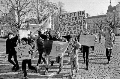 17 ноември 1989 – първият свободен митинг в София, в който има и странни плакати. Тази снимка според автора Георги Георгиев е символът на българския преход – слагаме на пиедестал това, срещу което се борим.