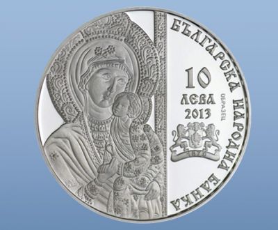 На лицевата страна са изобразени: вляво - реплика на чудотворната икона „Богородица умиление“ от Бачковския манастир; вдясно - номиналната стойност „10 лева“, годината на емисията „2013”, емблемата на БНБ с годината „1879” върху лентата; в полукръг - надпис „Българска народна банка”.