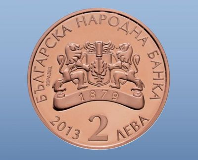 На лицевата страна на монетата е изобразена емблемата на Българската народна банка с годината „1879”, изписана върху лентата. Околовръст са изписани „БЪЛГАРСКА НАРОДНА БАНКА”, номиналната стойност „2 ЛЕВА” и годината на емисия „2013”.
