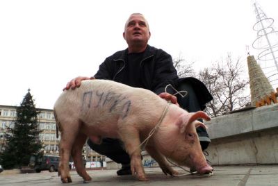 Небезизвестният шегаджия Росен Марков се появи на площад "Независимост" в центъра на Варна. Компания му правеше прасето Пурко, което по примера на американските президенти бе помилвано.