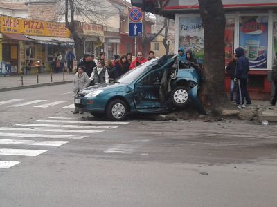 Около 7:30 часа днес в района на Кооперативния пазар се сблъскаха два леки автомобила - БМВ и Форд. В следствие на удара Форд-а се е забил в дърво и е смачкан до неузнаваемост.