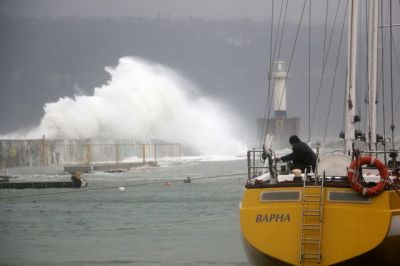 Причината е бурното вълнение и силният вятър. Температурата в района на пристанището е -4 градуса. Духа силен западен вятър, вълнението на морето е 4-5 бала, а температурата на морската вода е 6-8 градуса