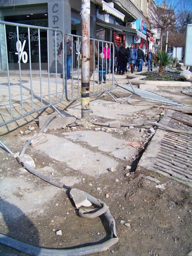 Само за последните три вечери потрошени и отарашени са осъмнали най-малко 7 магазина. Липсата на осветление в района на ремонта по Главната е довела до постоянни набези от крадци. Инструменти за взлом стават разхвърляните парчета от старата настилка, която фирмата изпълнител в момента отстранява.