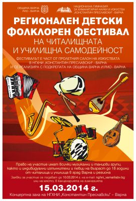 Утре - 15.03.2014 г., от 10.00 до 15.30 часа в Концертната зала на Национална гимназия за хуманитарни науки и изкуства „Константин Преславски” – Варна ще се проведе първият регионален детски фестивал на читалищната и училищна самодейност. Фестивалът е част от Пролетния салон на изкуствата в НГХНИ и се реализира с подкрепата на Община Варна и РИО - Варна, съобщиха организаторите за Moreto.net.