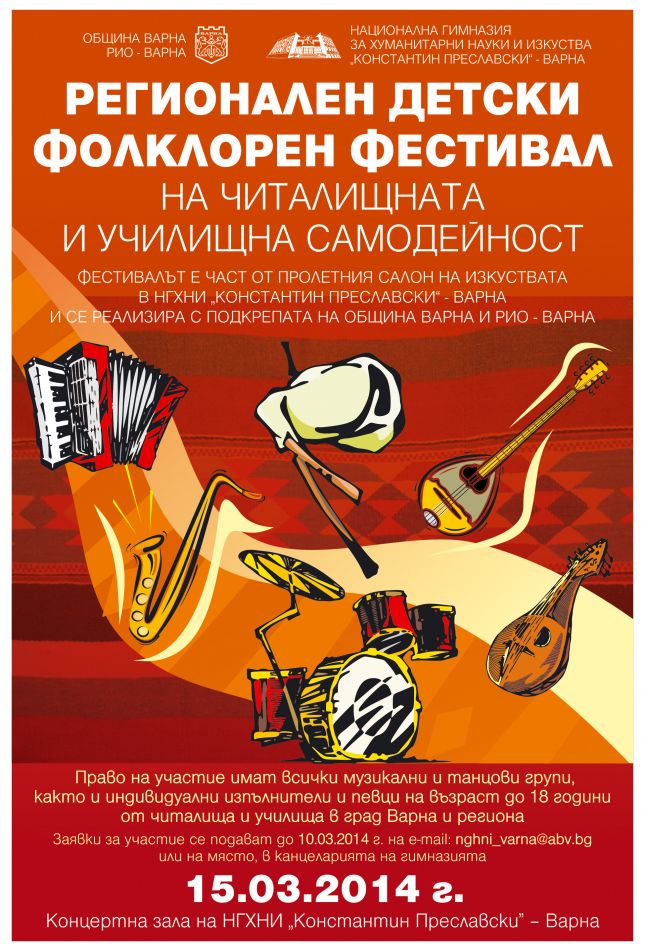 Днес - 15.03.2014 г., от 10.00 до 15.30 часа в Концертната зала на Национална гимназия за хуманитарни науки и изкуства „Константин Преславски” – Варна ще се проведе първият регионален детски фестивал на читалищната и училищна самодейност. Фестивалът е част от Пролетния салон на изкуствата в НГХНИ и се реализира с подкрепата на Община Варна и РИО - Варна, съобщиха организаторите за Moreto.net.