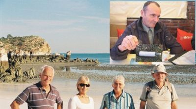 Валда и Франк с приятели на плажа, където е намерено писмото в бутилка от българския капитан Христов (на малката снимка) Сн.: в. Преса