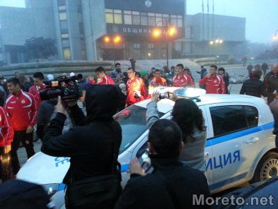 18:33 ч. В знак на съпричастност футболистите на ЦСКА излязоха от автобуса по екипи.