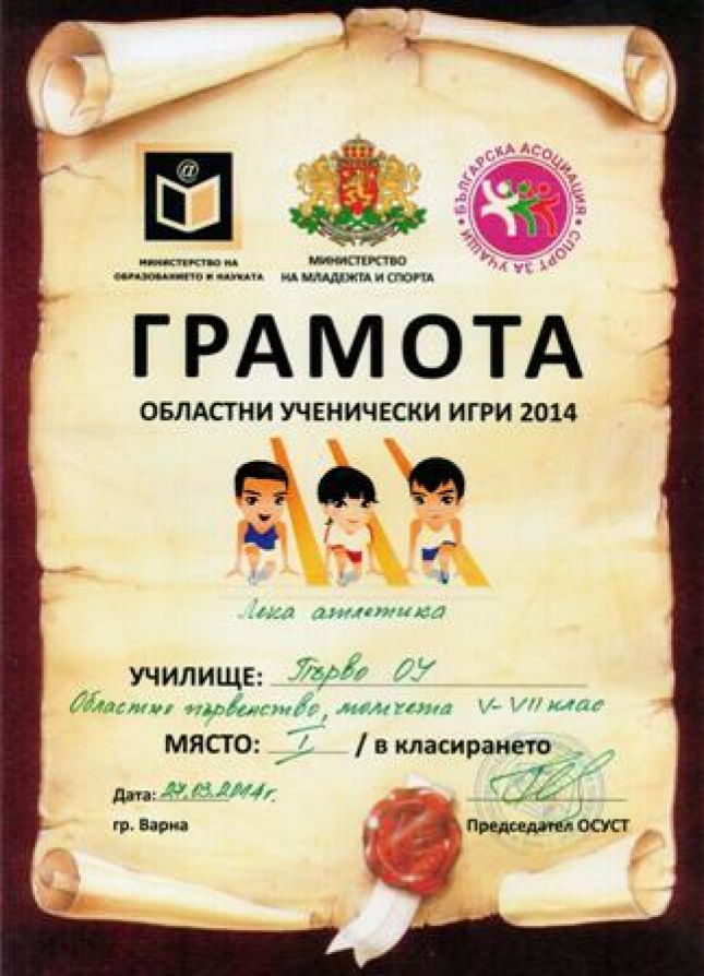 На 27 март 2014 г. отборът по лека атлетика на I Основно училище гр. Варна участва в Областните ученически игри за момчета от V до VII клас, научи Moreto.net.