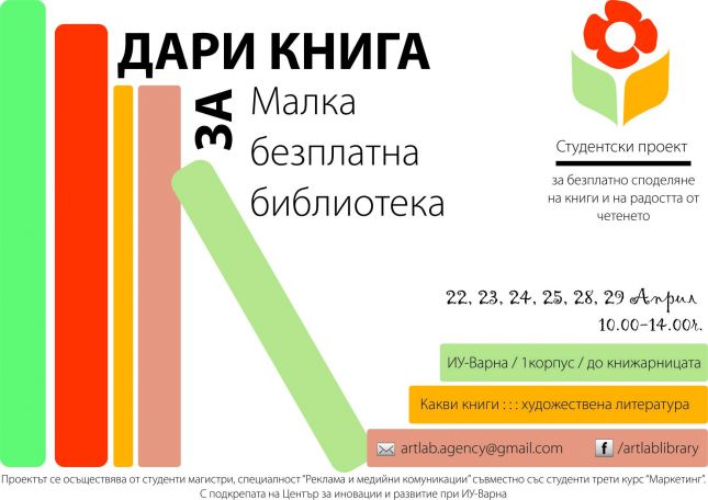 Студенти магистри, специалност „Реклама и медийни комуникации” заедно със студенти 3-ти курс, специалност „Маркетинг” от Икономически университет - Варна организират дарителската кампания за книги по студентския проект „Малка Безплатна Библиотека”, съобщиха организаторите за Moreto.net. Кампанията ще се проведе точно след Великден – от 22 април до 29 април в сградата на ИУ-Варна, I корпус, до книжарницата.