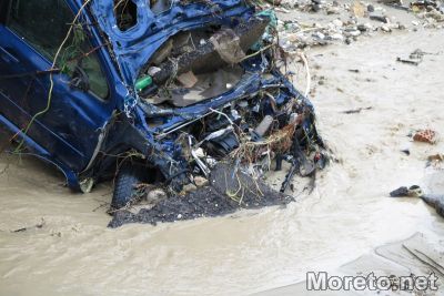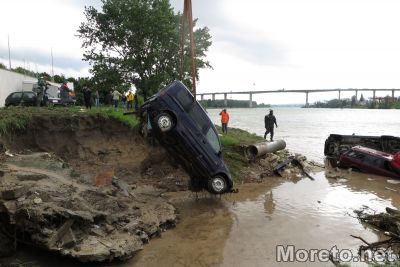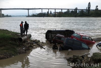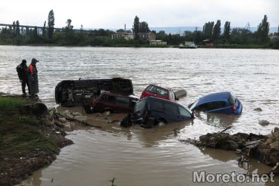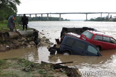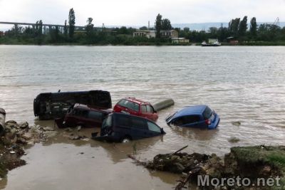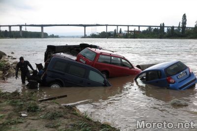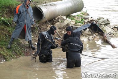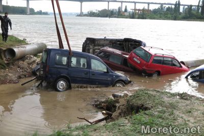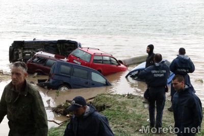 В близост до Сити Център Аспарухово има няколко коли, водата ги е изхвърлила в канала езеро -море, екипи правят да извадят тези с кран.