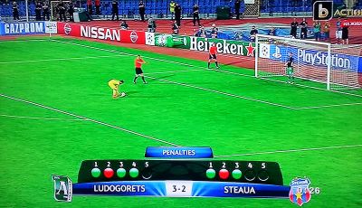 В 119-та минута Фернандо Варела получи извеждащ пас зад отбраната на Лудогорец, след което бе фаулиран от Владислав Стоянов. Съдията Ундиано Майенко изгони вратаря на Лудогорец с директен червен картон, а на вратата застана Козмин Моци. Стяуа не успя да вкара от фаула, който имаше възможност да изпълни. Никулае Станчиу изпрати топката над напречната греда в аут.