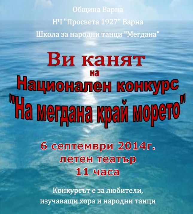 НЧ "Просвета 1927" Варна и школата за народни танци "Мегдана" Варна организират Първи национален конкурс "На мегдана край морето" на 6 септември, научи Moreto.net. Събитието е под патронажа на Община Варна, фонд „Култура” и в подкрепа на Варна кандидат за европейска столица на културата 2019.