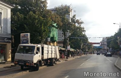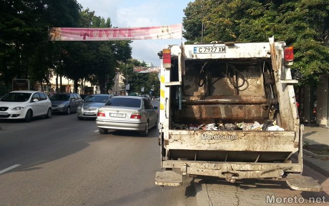 Тежкотоварното превозното средство спря върху положените само преди няколко години нови плочки на бул. "Княз Борис I" в района на Севастопол, с идея да не задръства движението, докато служители на чистотата прибираха чувалите със смет от съседните заведения.