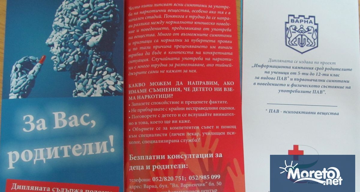 Превенция на употребата на наркотици е една от дейностите, които развива младежката организация на Български Червен кръст. През тази година екип от доброволци, подкрепен от РИО – Варна и дирекция „Превенции” на Община Варна, реши да насочи вниманието на родителите към този проблем. С професионалното участие на лекари специалисти от Наркологичното отделение на МБАЛ „Св.Марина” беше разработена информационна дипляна за ефекта на наркотиците върху човешкия организъм при еднократна и хронична употреба. В дипляната има и координати на Превантивно-информаионен център за безплатни консултации, съобщиха от БЧК-Варна за Moreto.net.