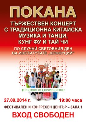 Тържественият концерт „Магията на китайската култура“ се организира по повод международния ден на институтите Конфуций. Той се организира под патронажа на Институт „Конфуций“ при Великотърновския Университет, Китайският Университет по Геонауки в град Ухан и централата на Ханбан (Институт Конфуций) Пекин. В програмата са включени примери на най-интересните китайски сценични изкуства – популярната Пекинска Опера, презентация на китайската гимнастика Тай Чи, солови изпълнения на национални инструменти, най-популярните китайски песни и разбира се един от символите на китай – бойното изкуство Кунг Фу. Срещата с най-интересното от китайските изкуство и бойни умения е уникална по рода си. Концертът няма да бъде представен дори в столицата София. Най-голямата сцена на която ще бъде изнесен е тази на ФКЦ – Варна. След това участниците заминават за други европейски дестинации. За да се докоснат максимално повече приятели на Китай до всичко това, входът за събитието ще е свободен, съобщиха организаторите за Moreto.net. Разпечатайте поканата по-долу и заповядайте с нея на 27 септември 2014 във Фестивален и Конгресен Център от 19:00 часа.
